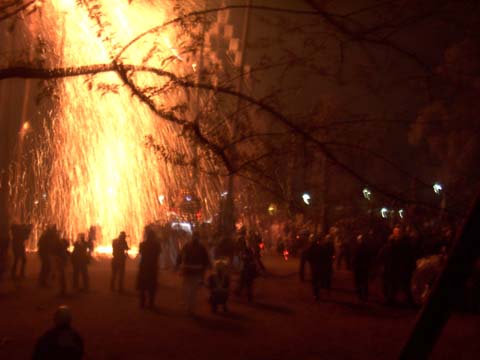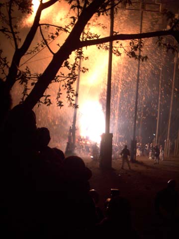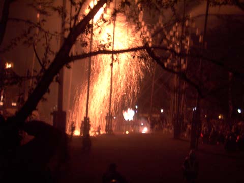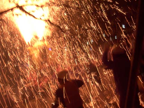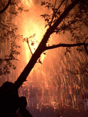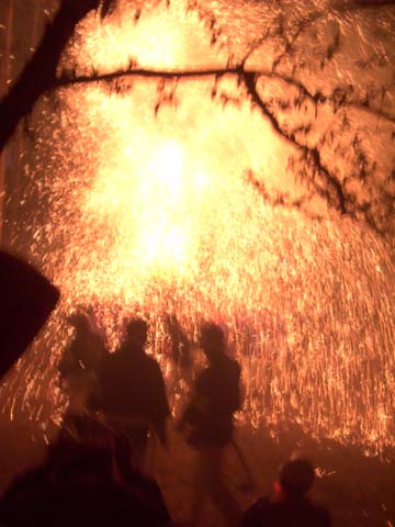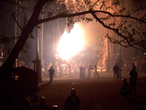 高さ数メートルの棒の先から、火の滝が延々とふりそそぐ。 風が強いため、観客にも容赦なくふりそそぐ。 そのうちに神社の木がめらめらと燃え出し、怒号と混乱のなかで、給水ポンプが出動する。 ホースから水がしぶきとあがる。しばらくして鎮火。観客は下手すると火の雨だけでなく水の雨も、ひっかぶる。 |