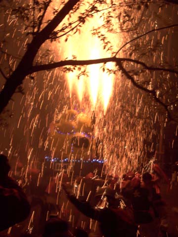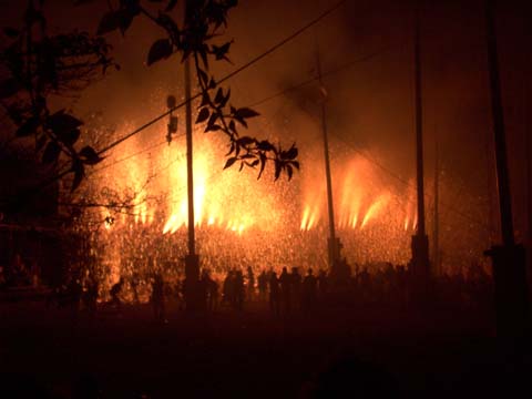 半鐘が鳴り響き、御輿が登場する。 上半身裸の若者たちに担がれた、この御輿自体にも花火がしこんであり、火炎が爆発したようなすさまじい勢いで噴出す。 火の雨が容赦なく人々にふりかかる。 |