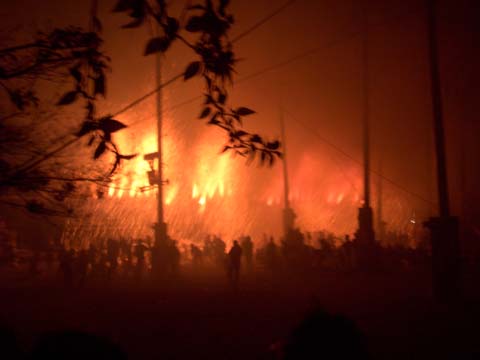 それが延々と続く。 もうもうたる白煙が境内を埋め尽くす。炎のなかで踊り続ける人々。 後に現地の人に聞いた話では、火の滝に入る人々は、やはり背中が火傷だらけになるそうである。このへんの人はさぞかし強い人間になることであろう。 |